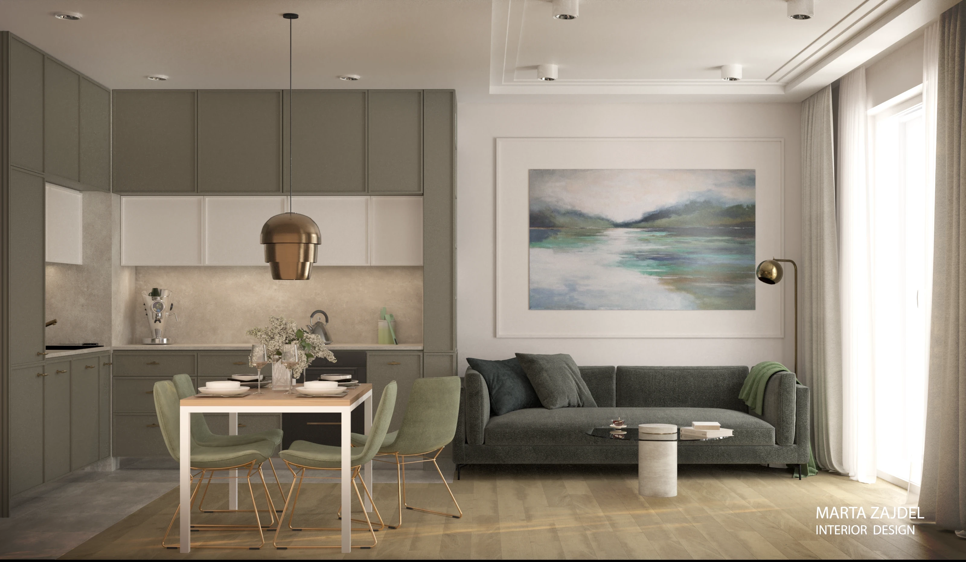 Odcienie ziemi, biel, szarość w towarzystwie szczotkowanego złota sprawiają, że wnętrze wypełnia harmonia i spokój.